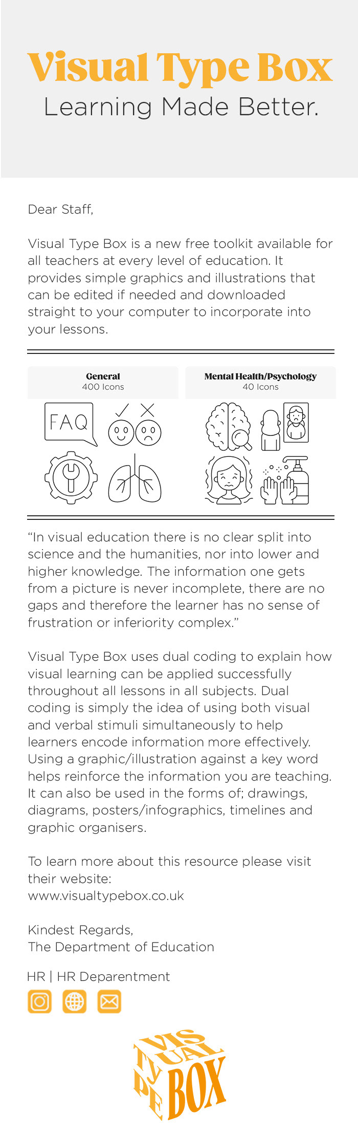 Visual Type Box was my final piece for my Masters Degree. I created a speculative design brief, for a free learning resource that all teachers at all levels had access to. This resource provides teachers with consistent visual learning templates including everything from icons, to diagram and infographic layouts